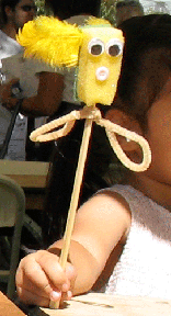 Method #1: Found-Object Rod Puppet Ingredients: Tools: What is a rod puppet? A rod puppet is any puppet on a stick. These are easy puppets to make and can be used as characters in your own puppet show. My group, Moodoo Puppets, often uses simple rod puppets in performances at festivals, museums, and parades in Los Angeles, and as audiences know, the effect is hilarious, surprising, and amazing. Let's make the puppet: Step 1) The body. Cut the sponge into the desired shape for the body. If you are using a metal scouring pad instead, this can be gently stretched or pulled apart to create a variety of interesting shapes. Helpful tips: if you have several different-colored pads available, use one color for the body and a different color for the head! Step 2) Insert the rod. You may want to get Mom or Dad to help with this. You may need to use scissors to cut a small opening in the bottom of your puppet's body. Step 3) The face. Glue on the eyes or buttons and draw the face with colored markers. Glue feathers on top for hair. Step 4) Arms and legs. Wrap the pipe cleaner around the stick and glue in place. Now shape the cleaner to make hands and feet. Great job! You’ve made a rod puppet! Now you're ready to give the puppet a name and make your own puppet show! _____________________________________________________________________________